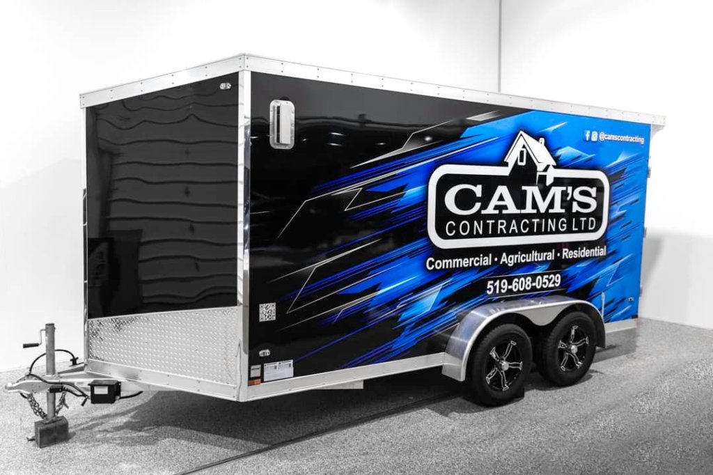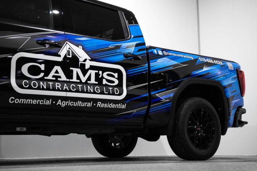 Check out Cam’s Contracting Ltd’s new truck wrap brought to life! Cam was looking for a bold eye-catching partial wrap design using blue that stands out on the road. With only wrapping half of the vehicle, we are able to provide the custom look of a full wrap while material/cost is saved. From design to reality here at DJD Graphics!