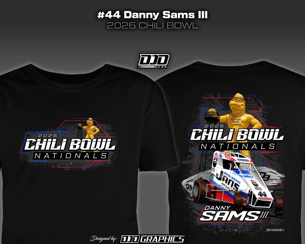 Chili Bowl Nationals shirt design for Danny Sams III! I always enjoy designing his merch – I had some fun with this one! Golden Driller transformed into the Gator Driller and tearing a ShopD3.com banner off the wall