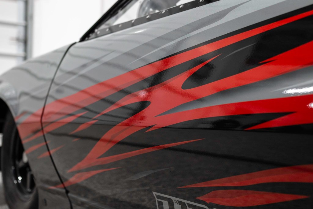 Full wrap on his Camaro drag car before his 2025 season. Had some fun on this one! He requested a painted look with grey/black/red. I created this design with the use of drop shadows to tie into the airbrushed look and a custom printed silver to give it a classy look. After I provided the rendering he was sold on it and we brought it to life printing it on @3M 3M Films metallic series wrap film to give it that metallic paint look ✨