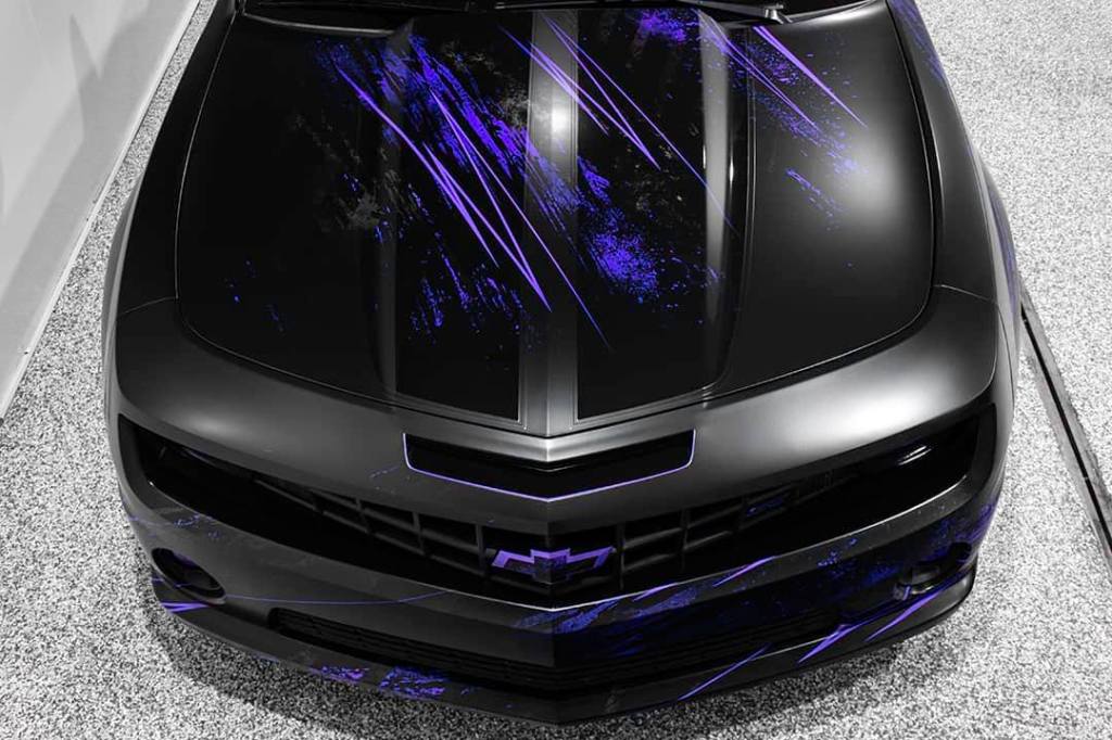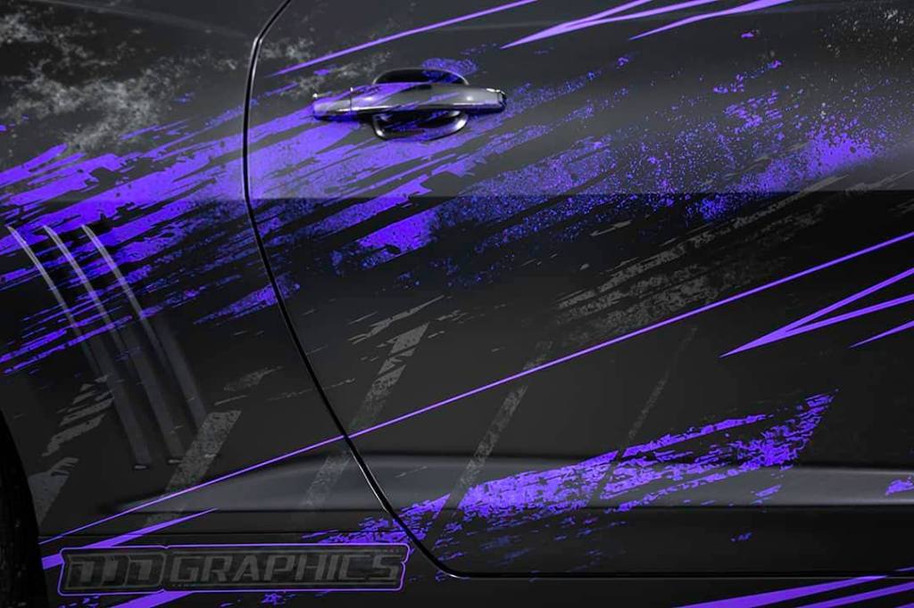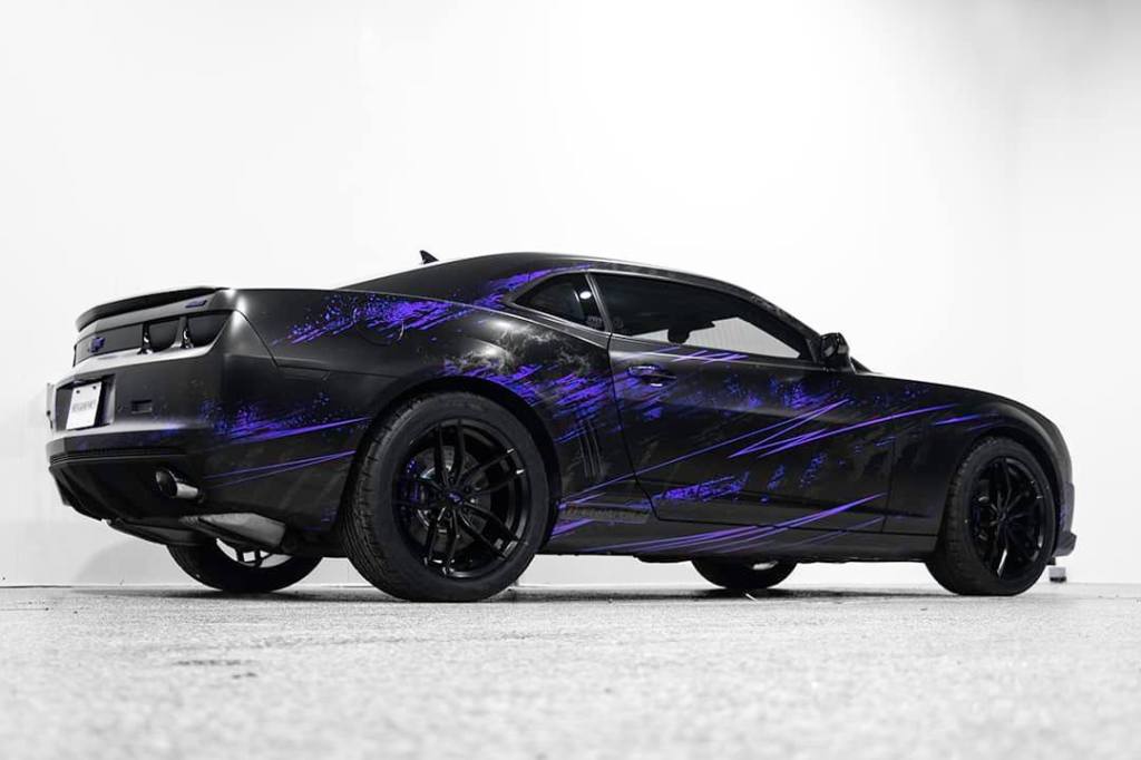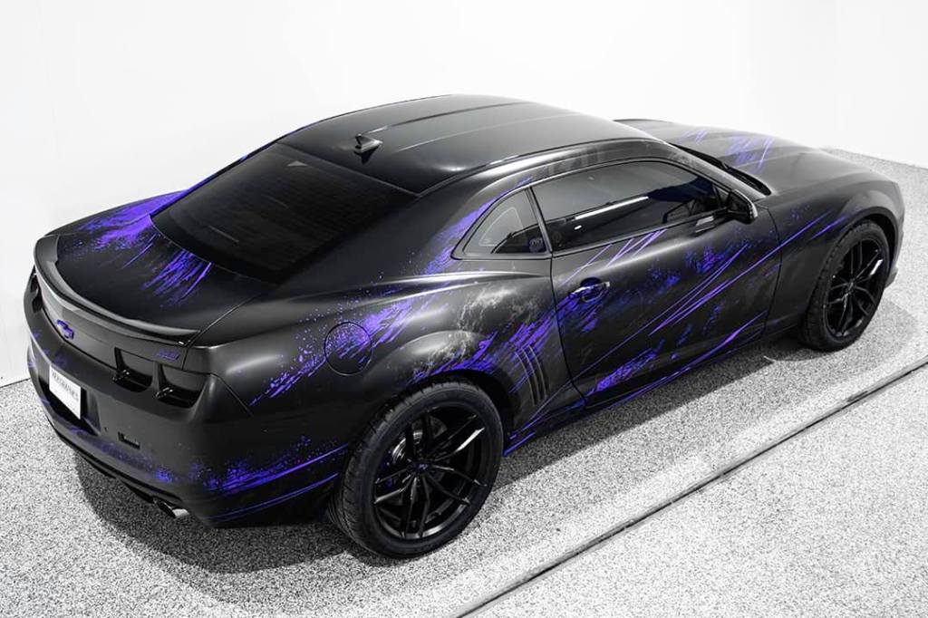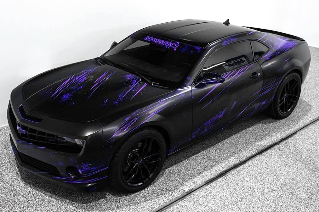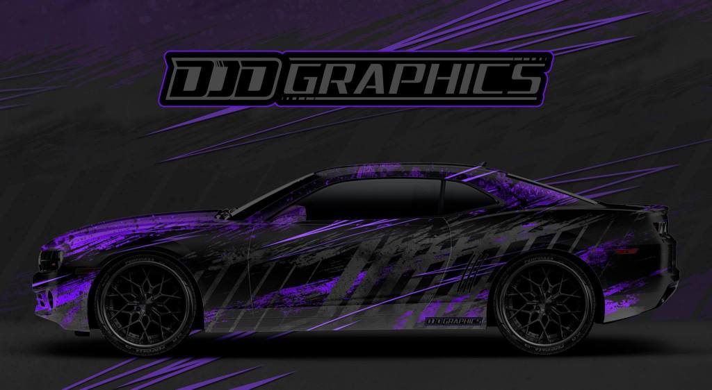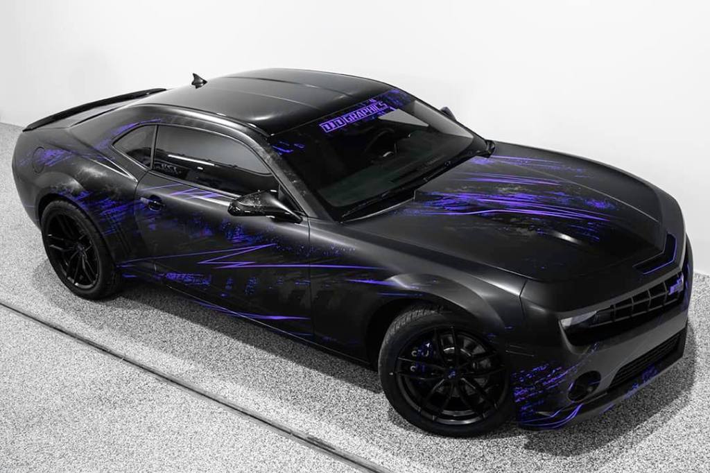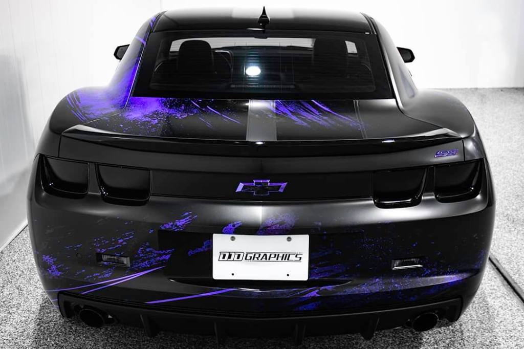 This Camaro came in with an aged and poor condition wrap that was lifting (previous owner had it wrapped). We removed it and covered up this RED Camaro with a custom design I created that was requested to be purple, grey and black. They gave me full creative freedom on this 2010 Camaro SS and they did not want to see any teaser or progress photos until it was complete…this is the result! Designed, printed and installed here at DJD Graphics