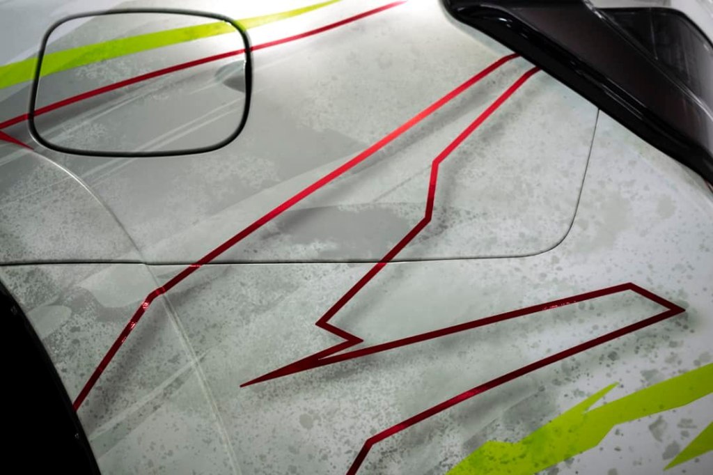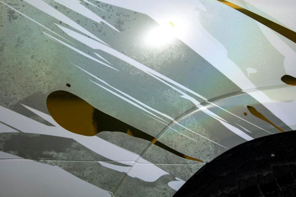 Lots of details on this one… custom asymmetrical design printed on a metallic white with rainbow pearl, red & gold chrome overlays, gloss ppf overlays on the yellow, custom forged carbon accents, embossments, tints and more. Then protected with 3M Ceramic Coating![]()