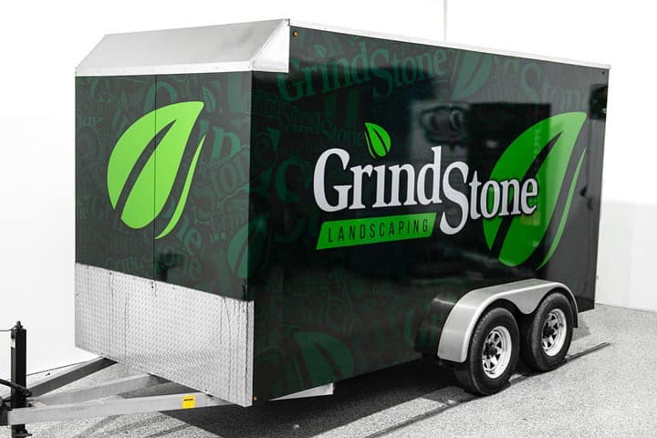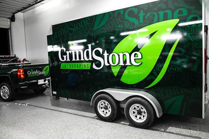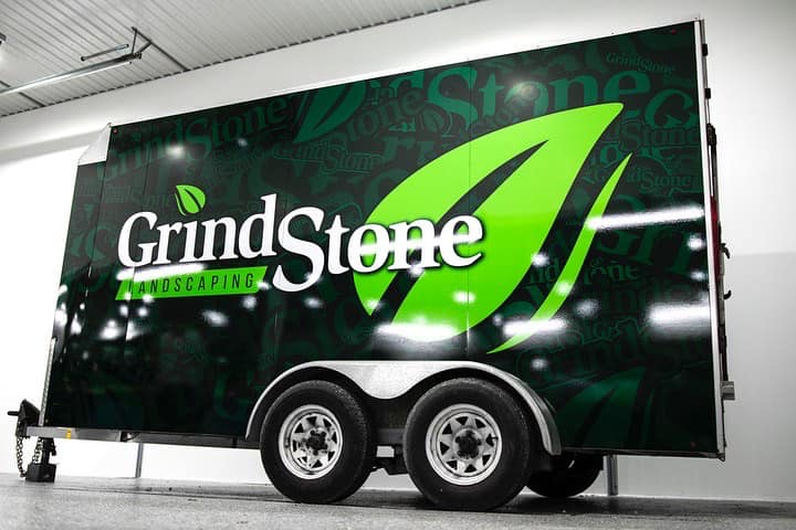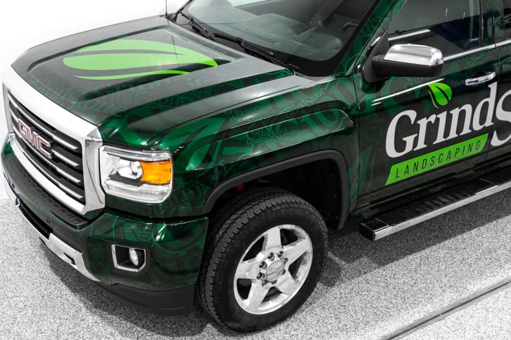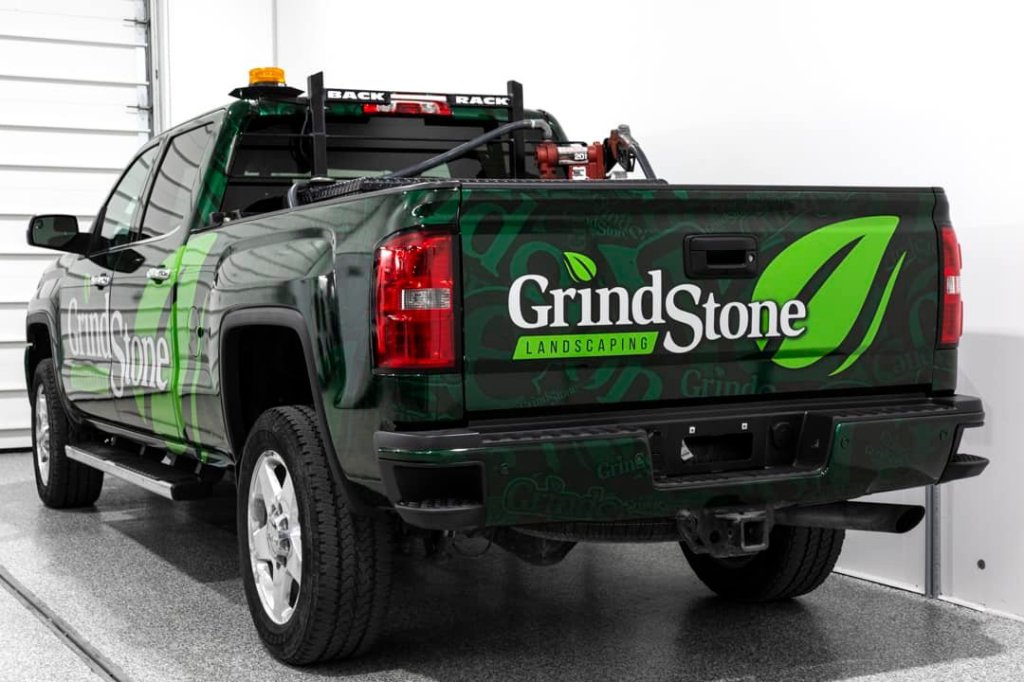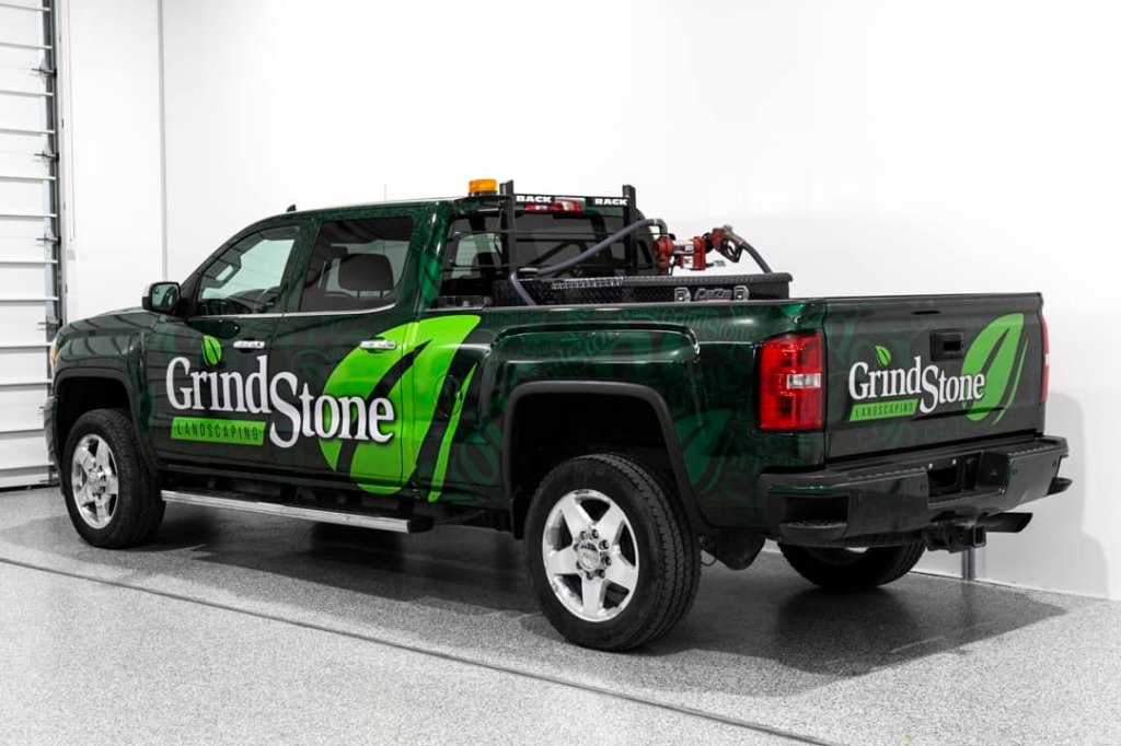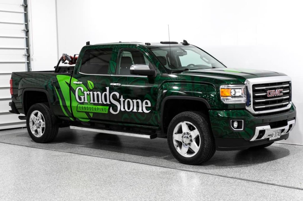 Full custom wrap and rebrand for Grindstone Landscaping. Printed on 3M printable metallic film. A clean and & modern look utlizing their logo for the pattern in the green. With the logos matching up across all body panels