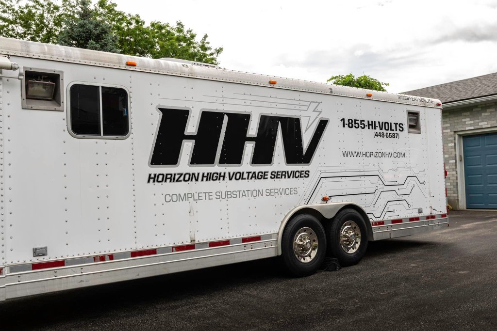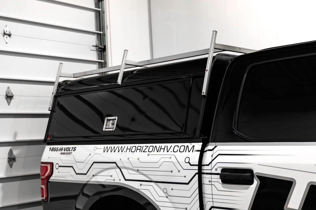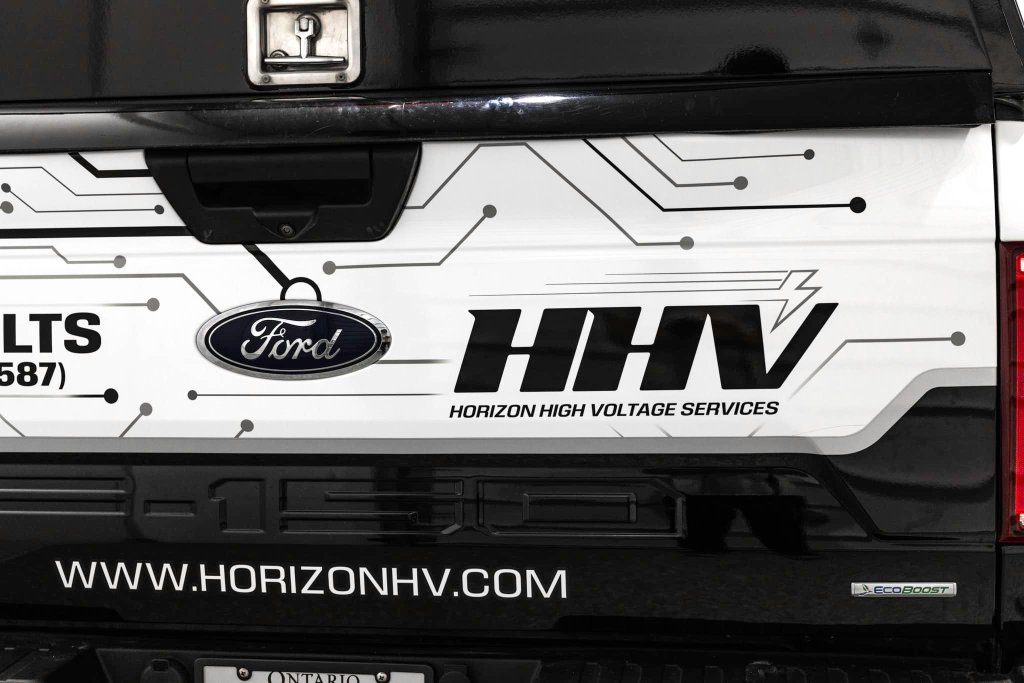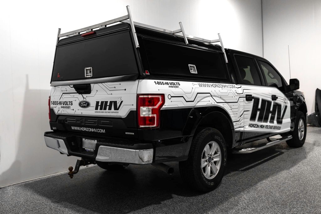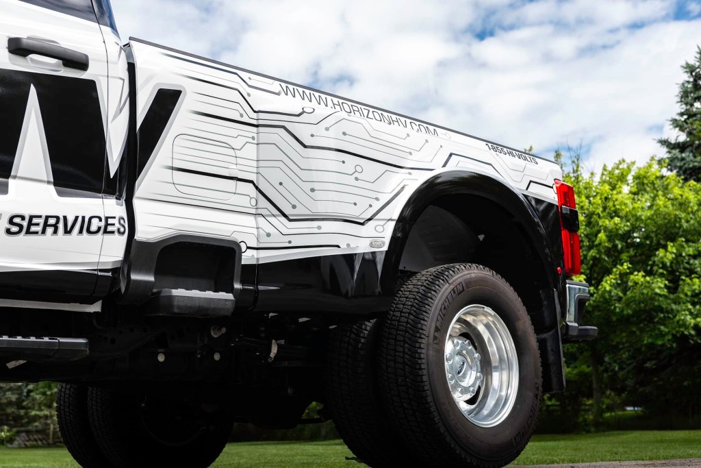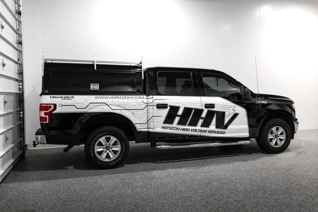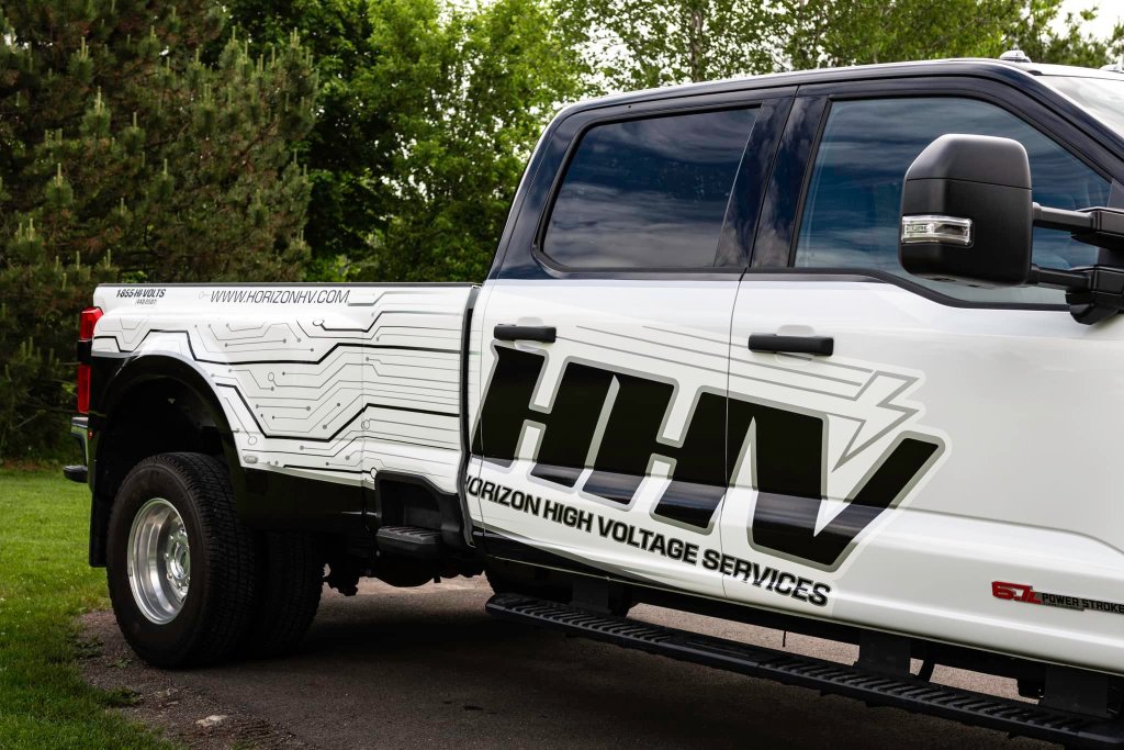 REBRAND! Designed a new logo and fleet design for Horizon High Voltage Services. They wanted an upgrade from simple text and they love their new look! A great way to improve your impressions on the road to increase sales! This is a partial wrap utilizing the original white of the truck (black areas and design are wrapped). Simple graphics on their trailer as well to complete the look at a fraction of the cost of wrapping the whole trailer.