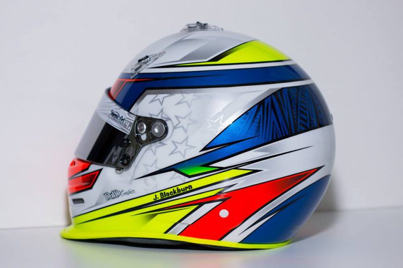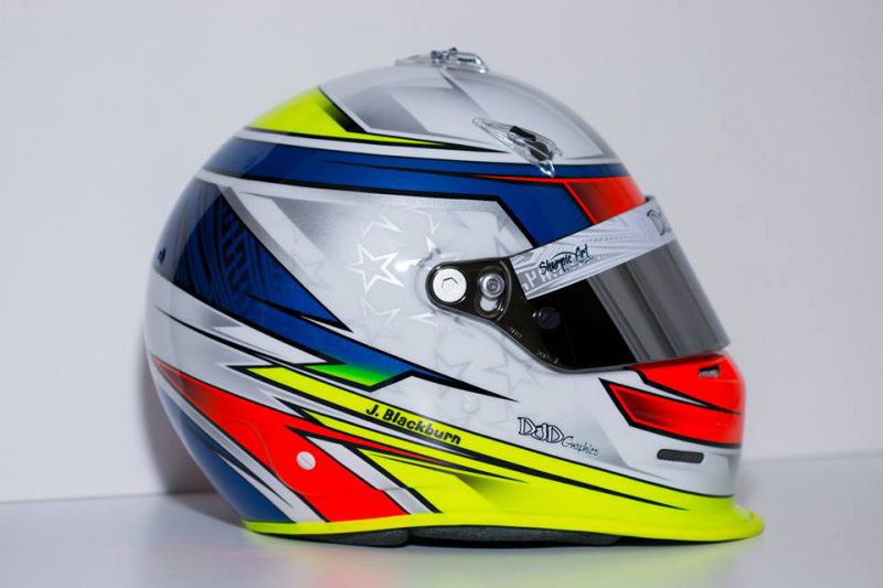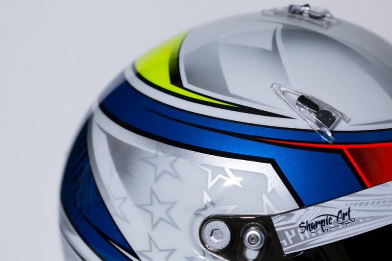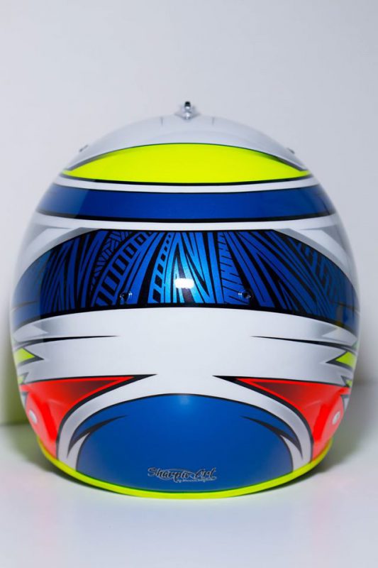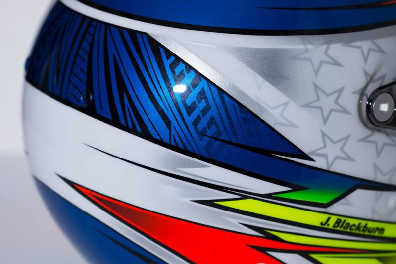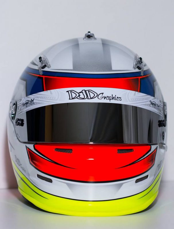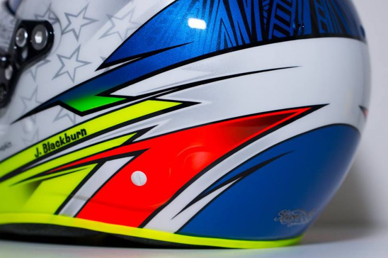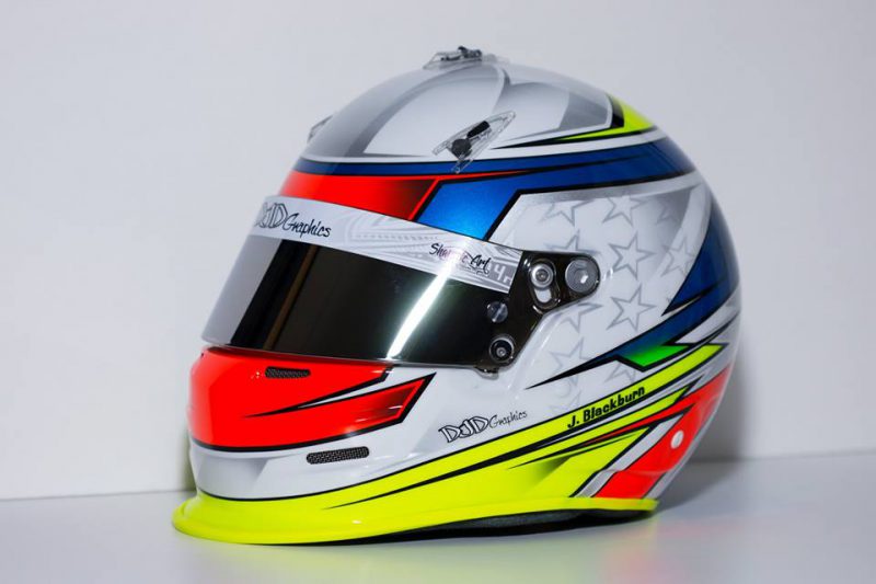 Jeff Blackburn’s fresh DJD Graphics BELL GP3 helmet for his 2017 season! Neon yellow, neon red, and metallic blue! This lid sure is bright. With the addition of an Antman Custom Trix neon yellow helmet trim to finish it off.