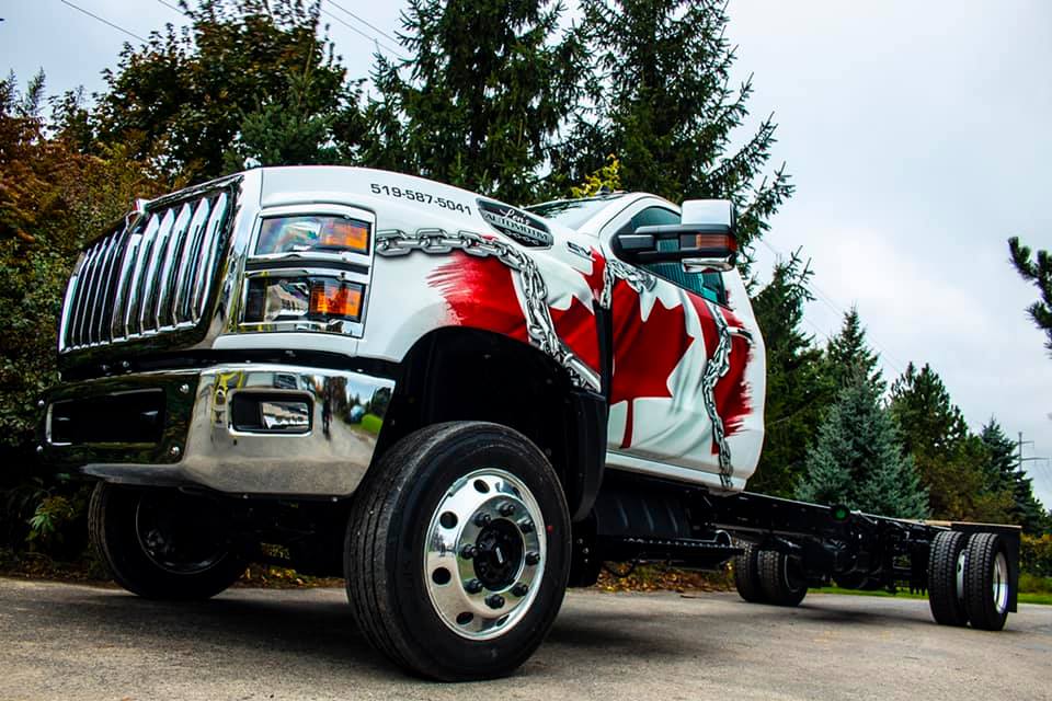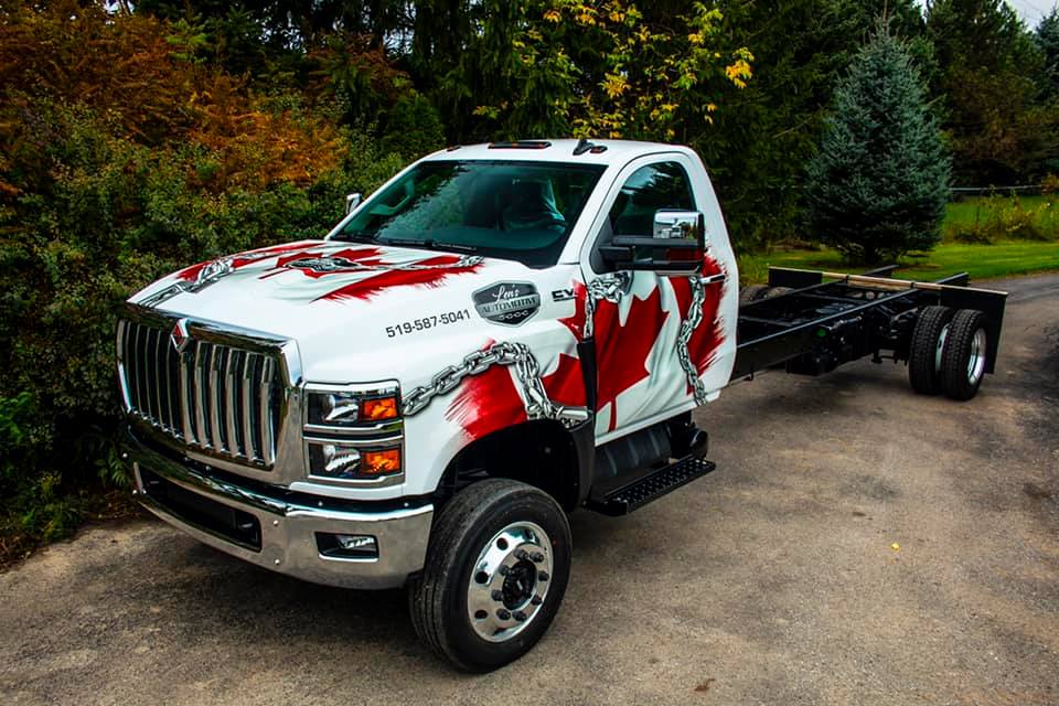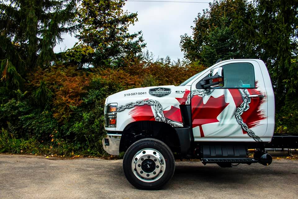 Custom wrap for Len’s Automotive’s new 2020 International CV tow truck. Truck came in black and client asked for a white truck with a Canadian flag wrapped in a chain on the truck…we did just that🔥🔗