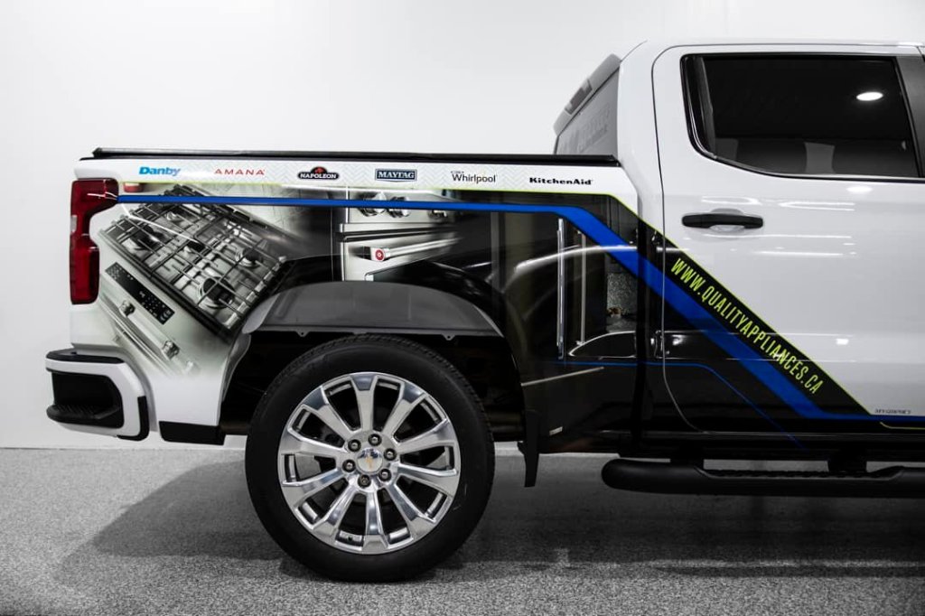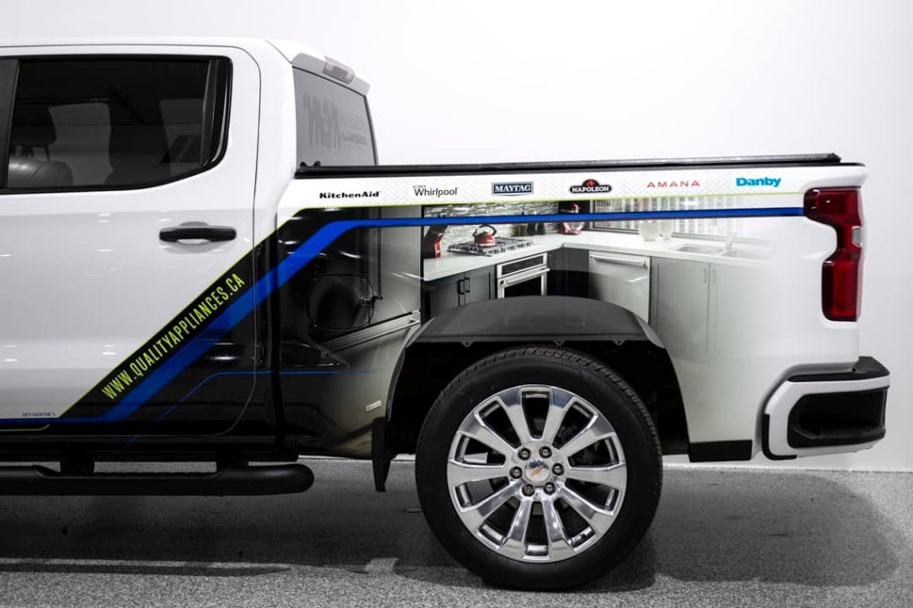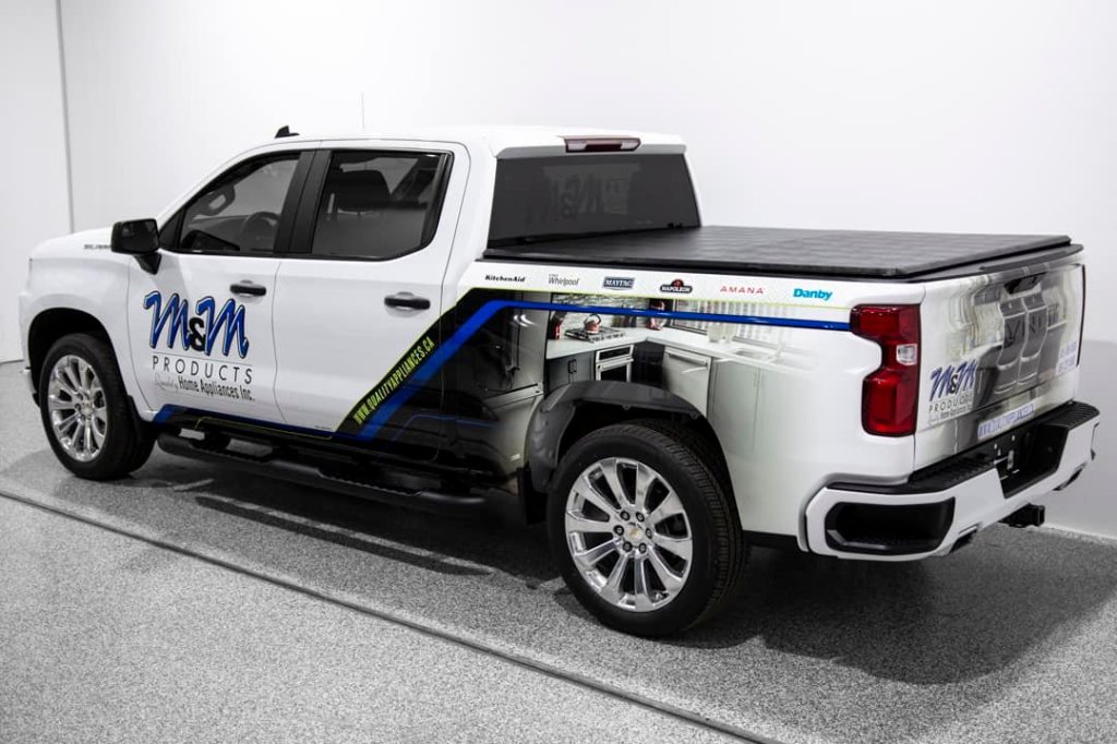 Custom half wrap designed, printed and installed for M&M Products Quality Home Appliances Inc.