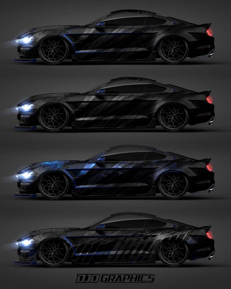 Design concepts created for a 350 Shelby I will be wrapping in the near future! These are the projects I absolutely love. The client originally wanted custom stripes over his dark metallic grey paint. After I explained the possibilities he wanted to see some examples and loved the idea that it will help protect the paint. He requested an aggressive looking wrap utilizing black, grey and blue accents to match his currently metallic blue calipers. These were the concepts I created…he loved them all and has made his pick. Stay tuned for this Mustang wrap and all the hidden details to come. Printed here on 3M metallic series film. Which one is your favourite concept??