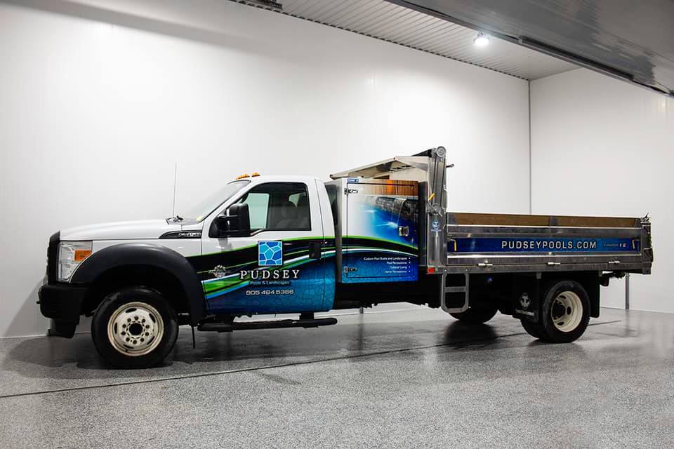 First truck of the fleet for Pudsey Pools & Landscapes Inc.Completed here at DJD Graphics from design, to print and install. Including a revamped logo design!