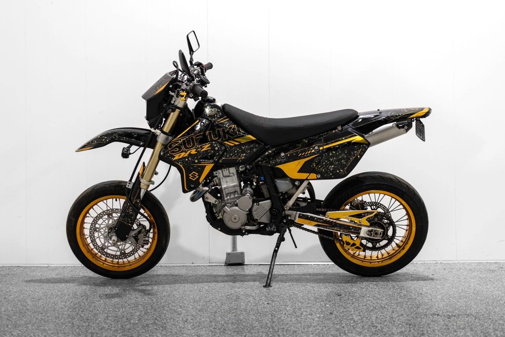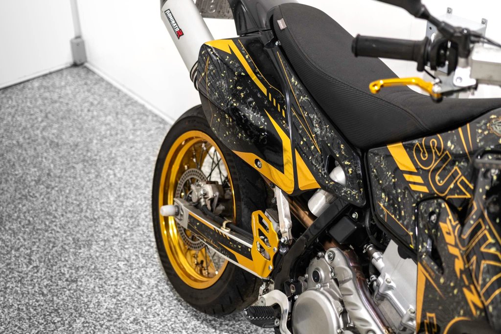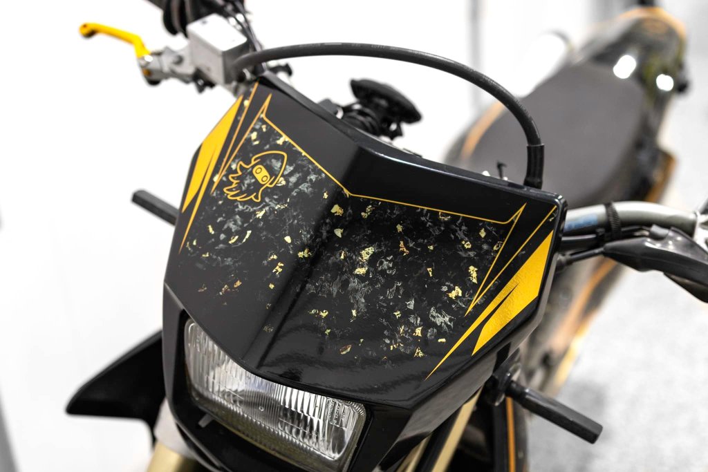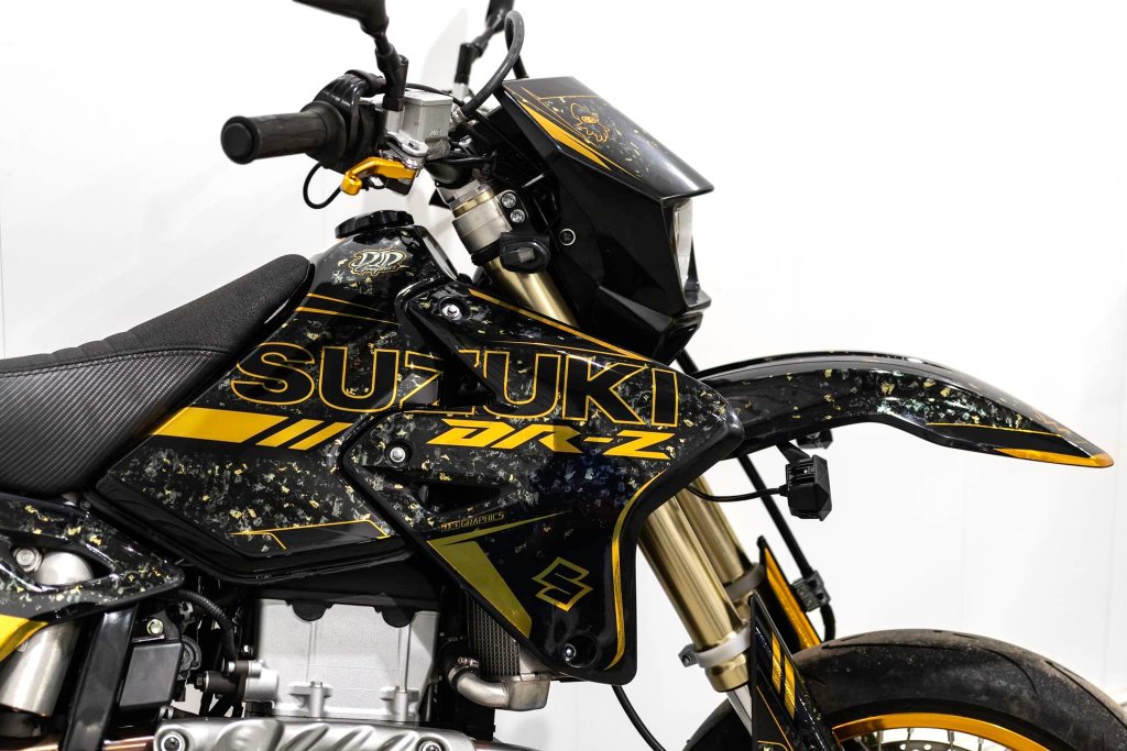 Check out this custom printed chrome kit we did on this DR-Z 400! He wanted custom printed chrome that matches his wheels, with a unique forged carbon fiber effect that has gold flake in it. This chrome sure stands out!